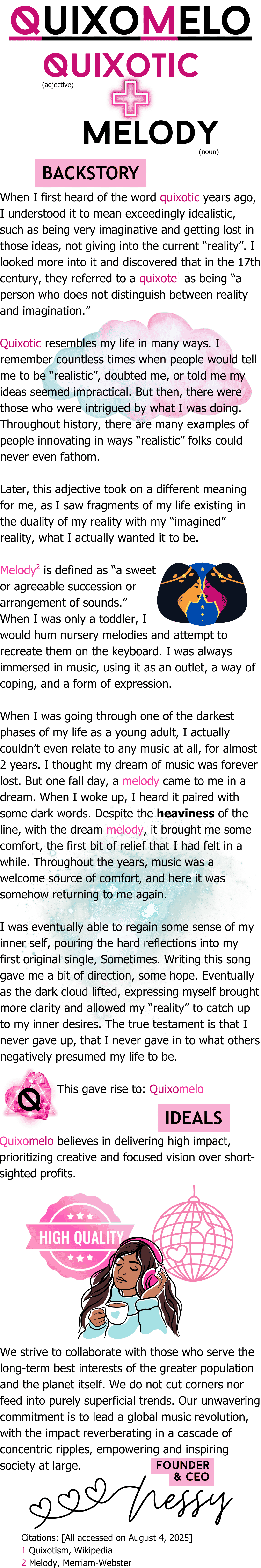 Nessy is the founder of Quixomelo, the brand created out of a love for sharing melodic sounds. Her artistic and entrepreneurial minds fused together are pivotal to the foundation of Quixomelo.